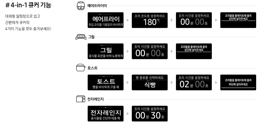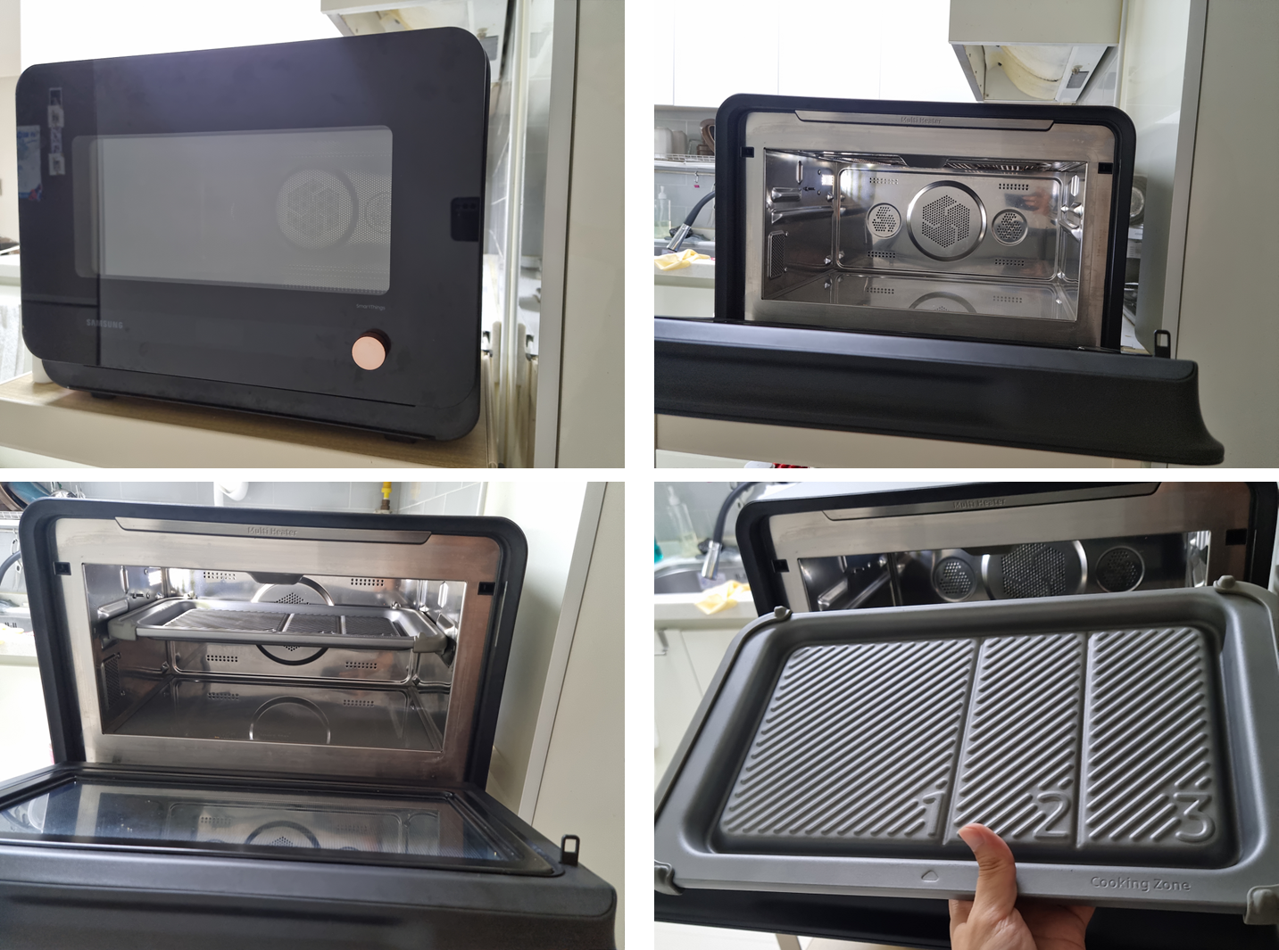 1. 비스포크 큐커는 전자레인지, 에어프라이어, 토스터, 그릴 기능을 하나의 제품으로 사용할 수 있다.
