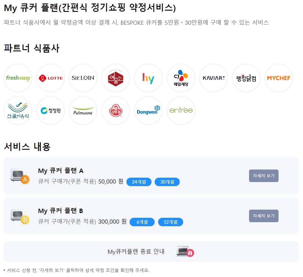 해당 약정 서비스를 이용하면 비스포크 큐커를 5만원에 구매가 가능합니다. 하지만 여기서 중요한 것은 삼성e식품 파트너 식품사의 제품을 한달에 약 4만원 정도 24개월 동안 구매를 해야합니다.