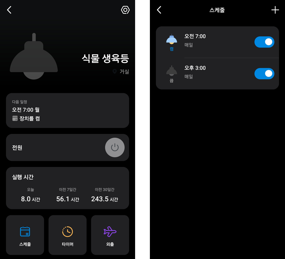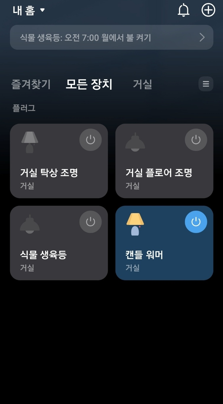 침실에 누워서 거실의 전등을 소등하고 제가 집에 오는 시간에 맞춰 양키 캔들을 키고 원하는 시간에 식물 생육등을 키고 끕니다.