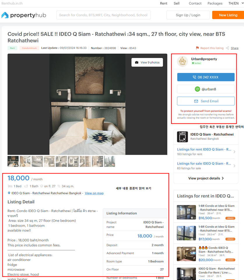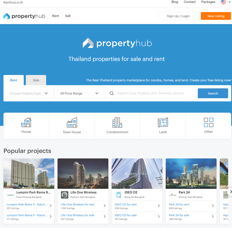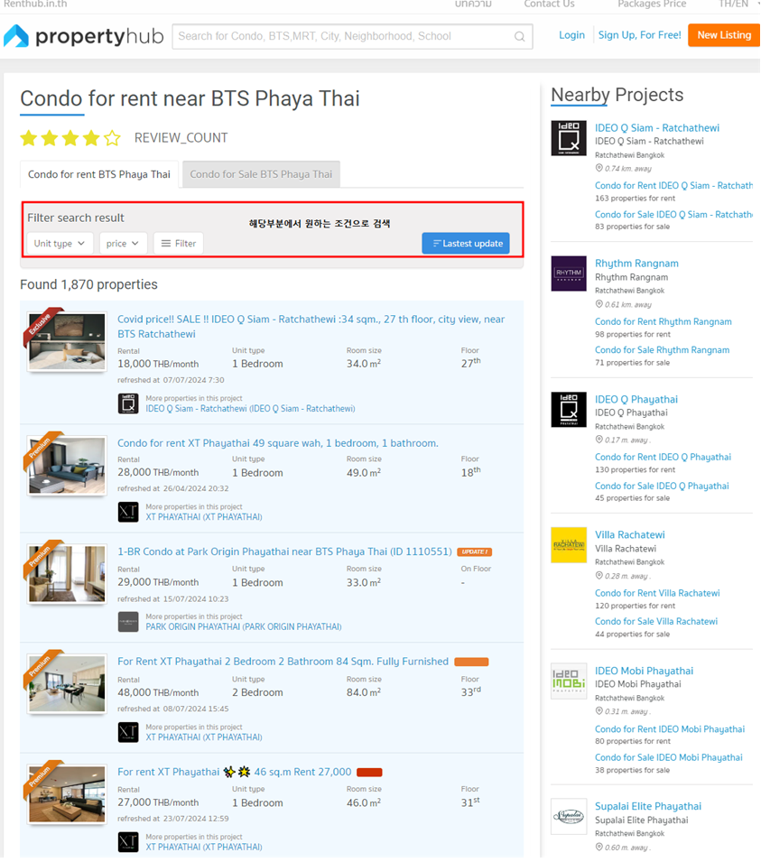 해당 사이트는 rent hub와 같은 사이트로 생각되는데 rent hub에서 매물을 찾아보면 property hub로 연동되더라구요? 그냥 rent hub만 쓰셔도 될거 같기는한데 혹시 제가 잘 못알고 있는게 있을까봐 사이트를 알려드립니다.해당 사이트도 영어와 태국어를 지원하고 전체적인 내용은 rent hub와 비슷합니다.